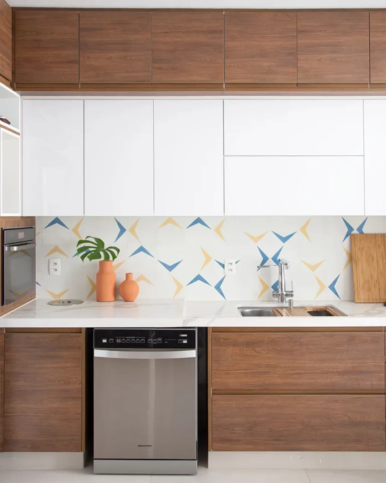 A entrada do apartamento era um grande corredor que estreitava a cozinha e não era funcional. Eliminamos a parede divisória, ampliando a cozinha iluminando mais o ambiente. A ideia foi fazer uma cozinha colorida com bastante bancada e espaço para refeições rápidas.